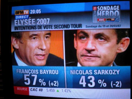 文学の先生だったバイルー、確かにクリーンな人のようだし、私の目にも「青い」のでは?と思えてしまう。が、2月末、TVの討論番組で見せた、ちょっとどもるような話し方で、現在のフランスの実情を立て直すにはなにより教育である、そのためには右も左もない、挙国一致体制で望むと言い切ったピレネーの農夫の息子には、力と光があった。当選したら首相は社会党から選ぶ、とも宣言したためか、今月初め、サルコジ(28%)のあとにロワイヤルと同じ23%で並んでしまった。社会党は大パニック。