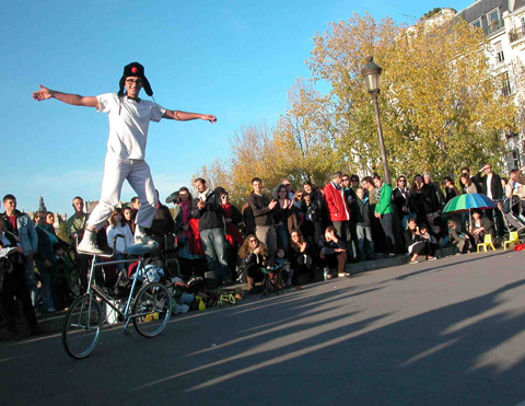 フェリックスの出し物が終わると、隣にスーツケースを置いていた背の高い北欧系の青年がフランス語と英語で早口で自己紹介しながら人集めをする。フランス語には英語訛りがあるものの、じつに流暢な、しかも笑いを取りながらの話術に引きつけられ、人が次々集まってくる。彼は本物のジャグラーだ。