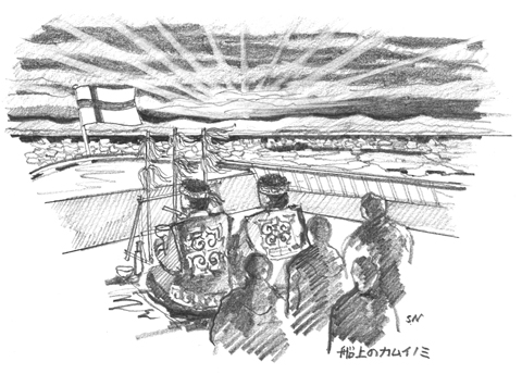 旅も中盤に差し掛かった頃、スウエーデンから砕氷船(フェリー)に乗ってフィンランドに航る時の事である。夜に船に乗り、氷を割る音を聞きながら寝ている私たちの所に、早朝4時〜5時頃だったか、千家さんが「お祈りを始めるので、来てくれないか」と私たちを起こしに来たのです。凍りつくような寒さの中、副団長と4人で甲板に出て船首に行ってみると、そこには、アイヌ衣装で正装した、床さんと千家さんが御幣を飾った祭壇(小刀でその場で作ったもの)の前に座り、祭事に使う食器や道具を手にして、お祈りの準備をしていた。彼らの後ろに座る様に言われるとすぐに、「これから私たちは世界平和と、この大地の神々と海の神々に旅の安全をお願いするお祈りをします」と祭事が始まりました。イクパスイと云う木製の小刀の様なものにお酒を付けて、四方に振り、お祈りが無事終わったその時、私は、身震いするような、鳥肌のたつ感激を覚えた。私にとっては、見るものや所作が初体験、しかも北欧の厳冬の海の上、海面や遠くに見える陸地も真っ白なまだ朝日の昇る前の空気が止まって居る様な、シーンとした世界。あたりは「夢か」と思うような神秘的な空気に包まれていた。又、「世界平和のために」と言う言葉が、二人のアイヌをさらに輝かせ、衣装のアイヌ文様がますます輝いて見えた。まさに自然との共生の原点をかいま見た瞬間でもあった。